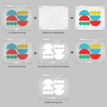 Choose full-colour printing + white ink on the back of the contents to add white ink only behind text, logos, or design elements. The rest of the sign remains clear with a sleek, transparent look. It makes your design and text clear and readable.