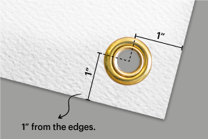 Add Grommets to the preferred part of your clients’ Cardstock Signs for easy hanging. Choose the number of Grommets based on the size of the sign. Our Grommets are .75" metal rings that let your clients hang their Cardstock Sign with ropes, zip ties, or hooks. Standard Grommet placement is 1" on the centre from the edge.